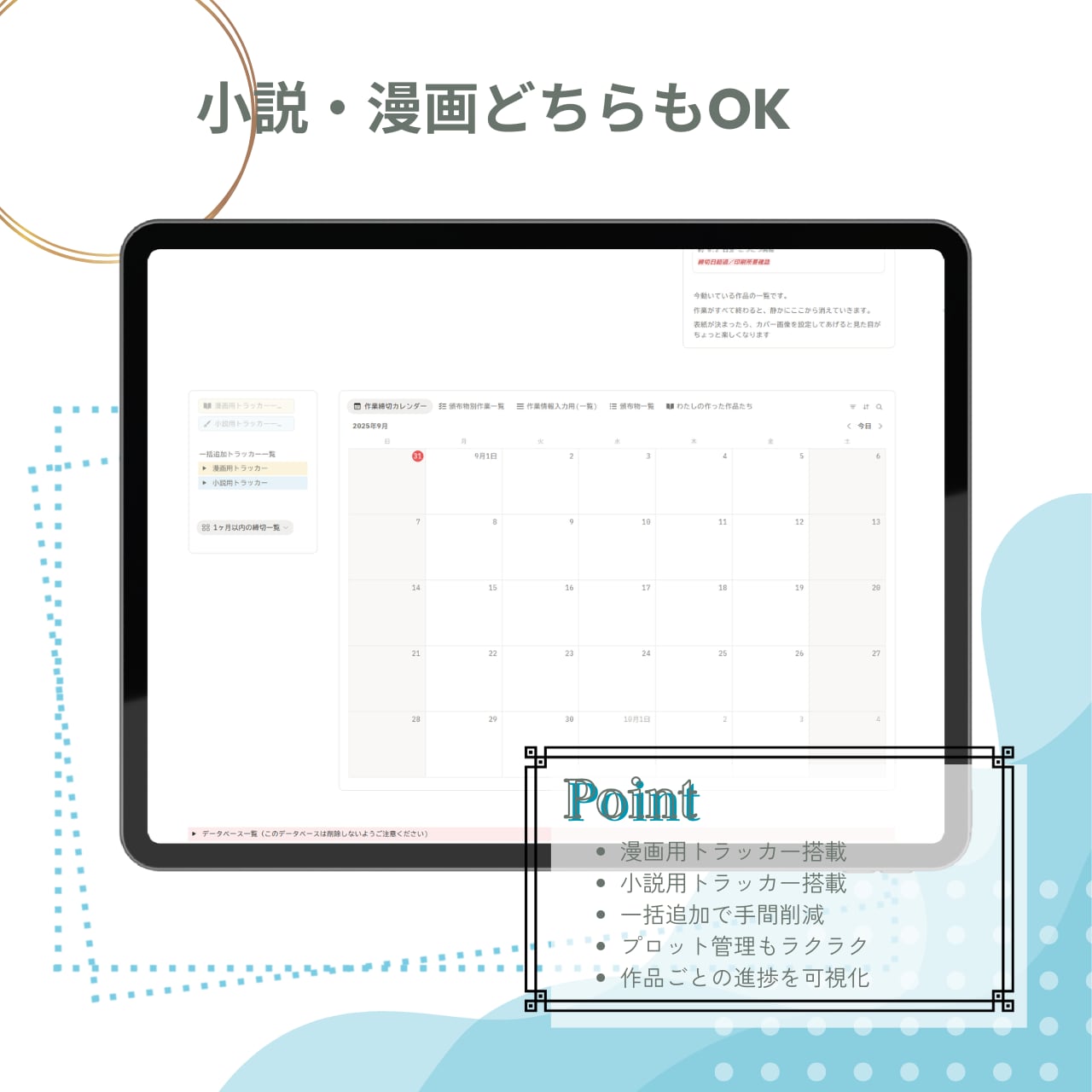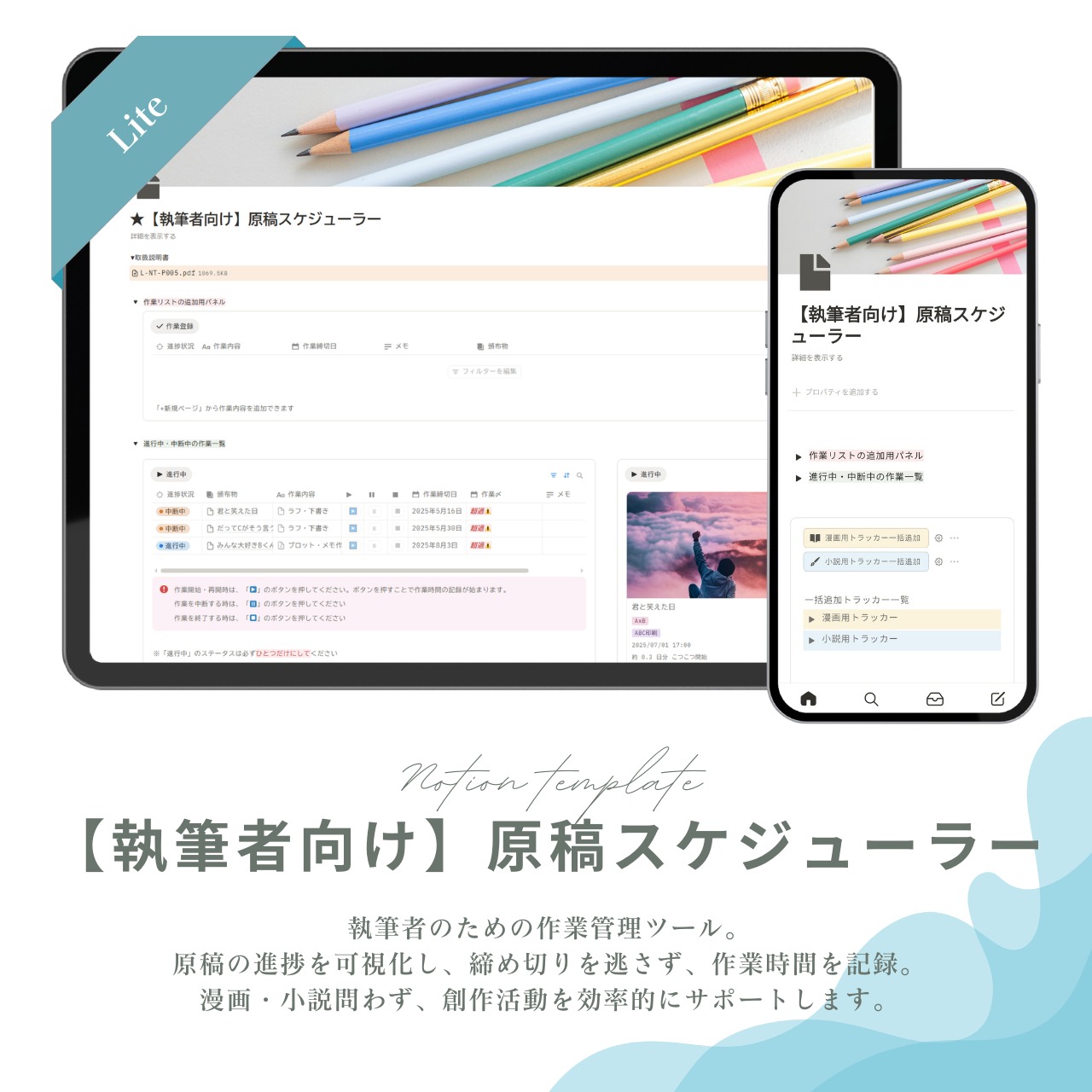 創作の楽しさを損なう「管理」を、できるだけ軽く。私自身の執筆・制作フローから生まれた設計で、締切管理・進捗管理・時間記録をNotionで一つにまとめました。原稿トラッカーとしての使いやす